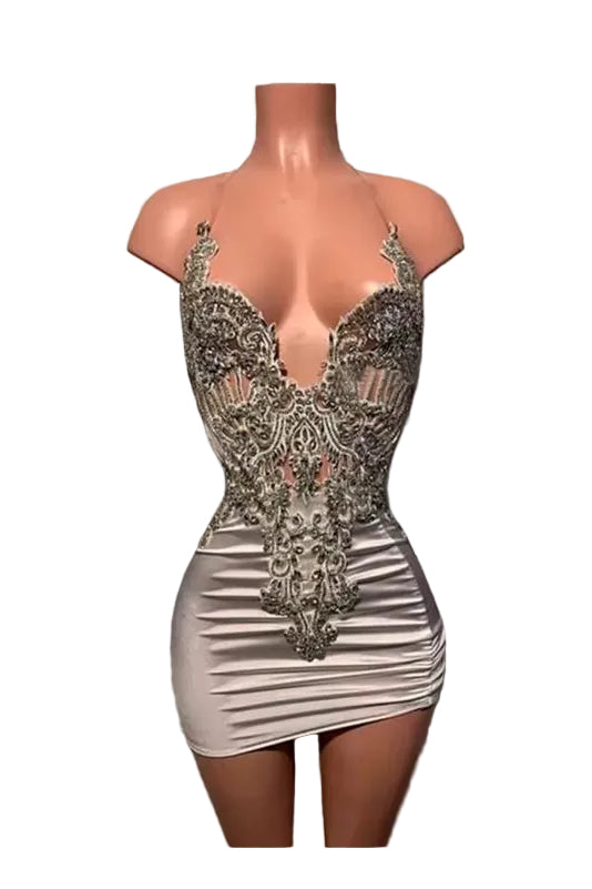 The Elvisha Halter Deep V-Neck Mini Dress is your go-to piece for turning heads and feeling fabulous. This flirty number features a daring deep V-neckline and flattering halter design that keeps you secure while showing off your style. The mini length hits just right for a night out or special occasion. Slip into this dress and let your confidence do the talking—because sometimes the best accessory is attitude.