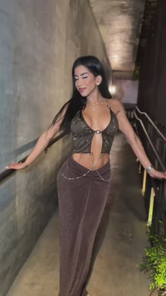 Sashay into the spotlight with our Katmir Chain Strap Cut Out Maxi Dress! This head-turning number features edgy cut-outs and luxe chain straps that'll have everyone asking, "Where'd you get that?" Perfect for those nights when you want to turn the dance floor into your personal runway. Strut, twirl, and pose – this dress was made for unforgettable entrances!