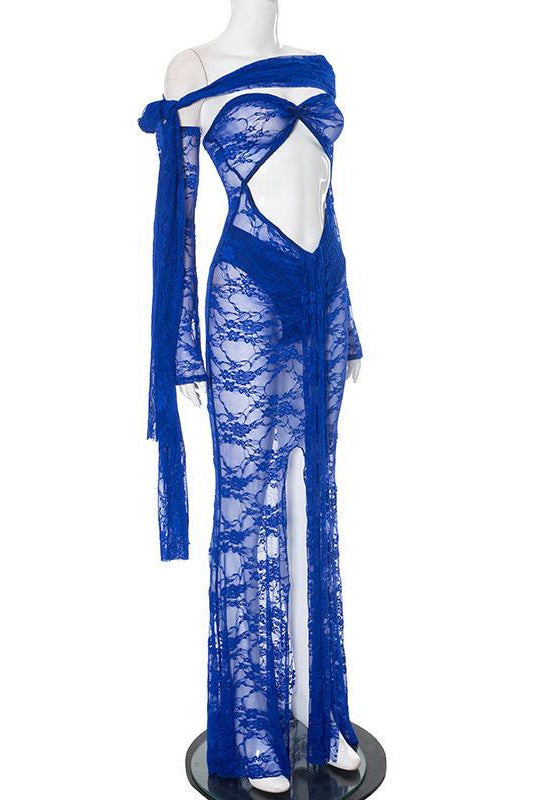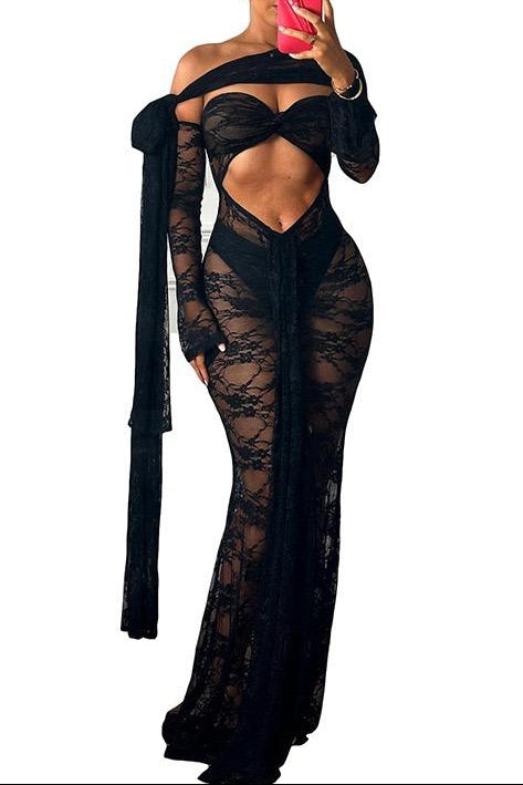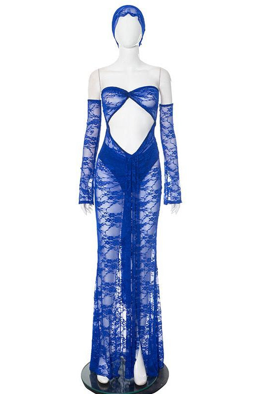Jessica Bara Xani Lace Cut Out See Through Maxi Dress and Bottom Set with Sleeves