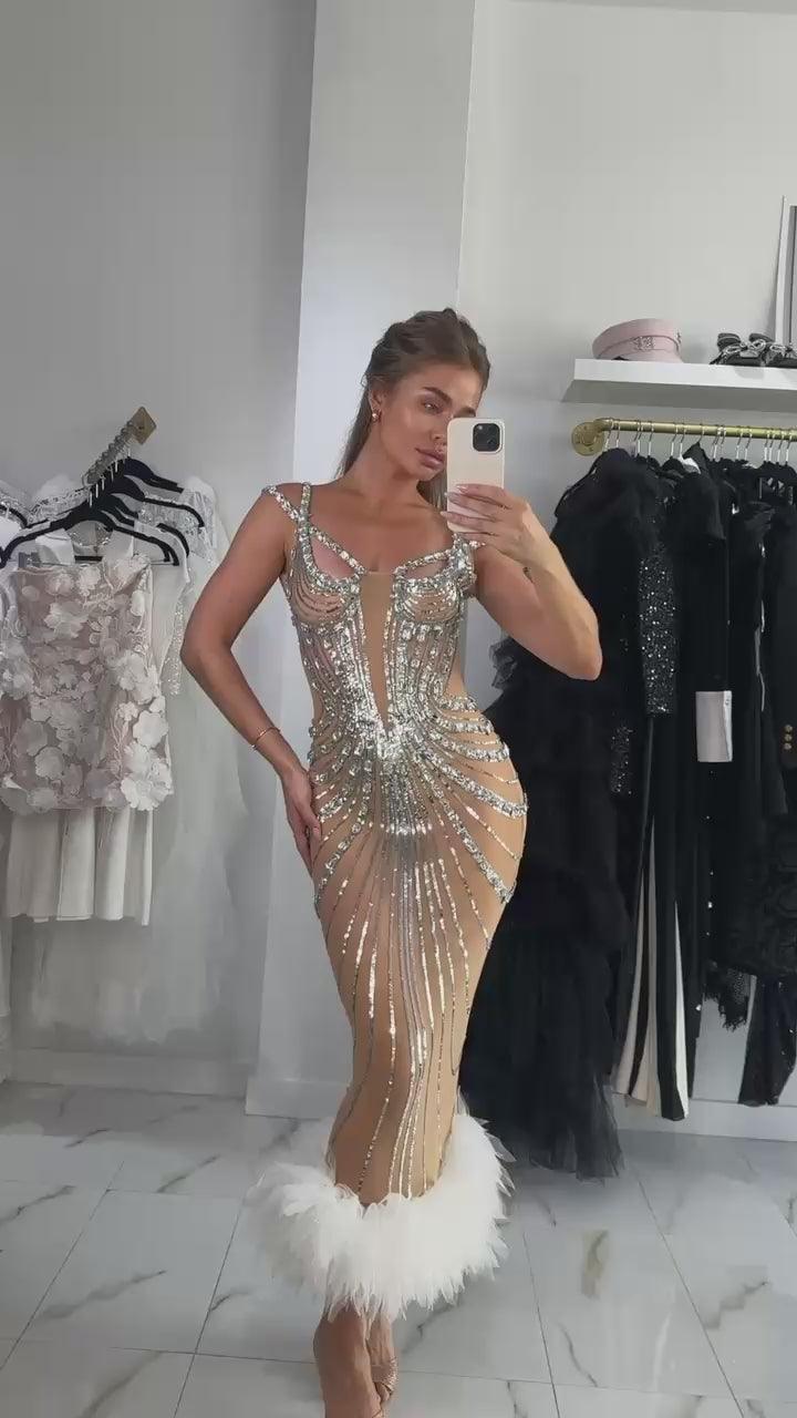 Be the ultimate fashion queen in this Jessica Bara Katniss Crystal Feather Maxi Dress. With crystal detailing and unique feather design, you'll stand out in any crowd. Perfect for a glamorous evening or special occasion. Who needs wings when you have this feather dress?