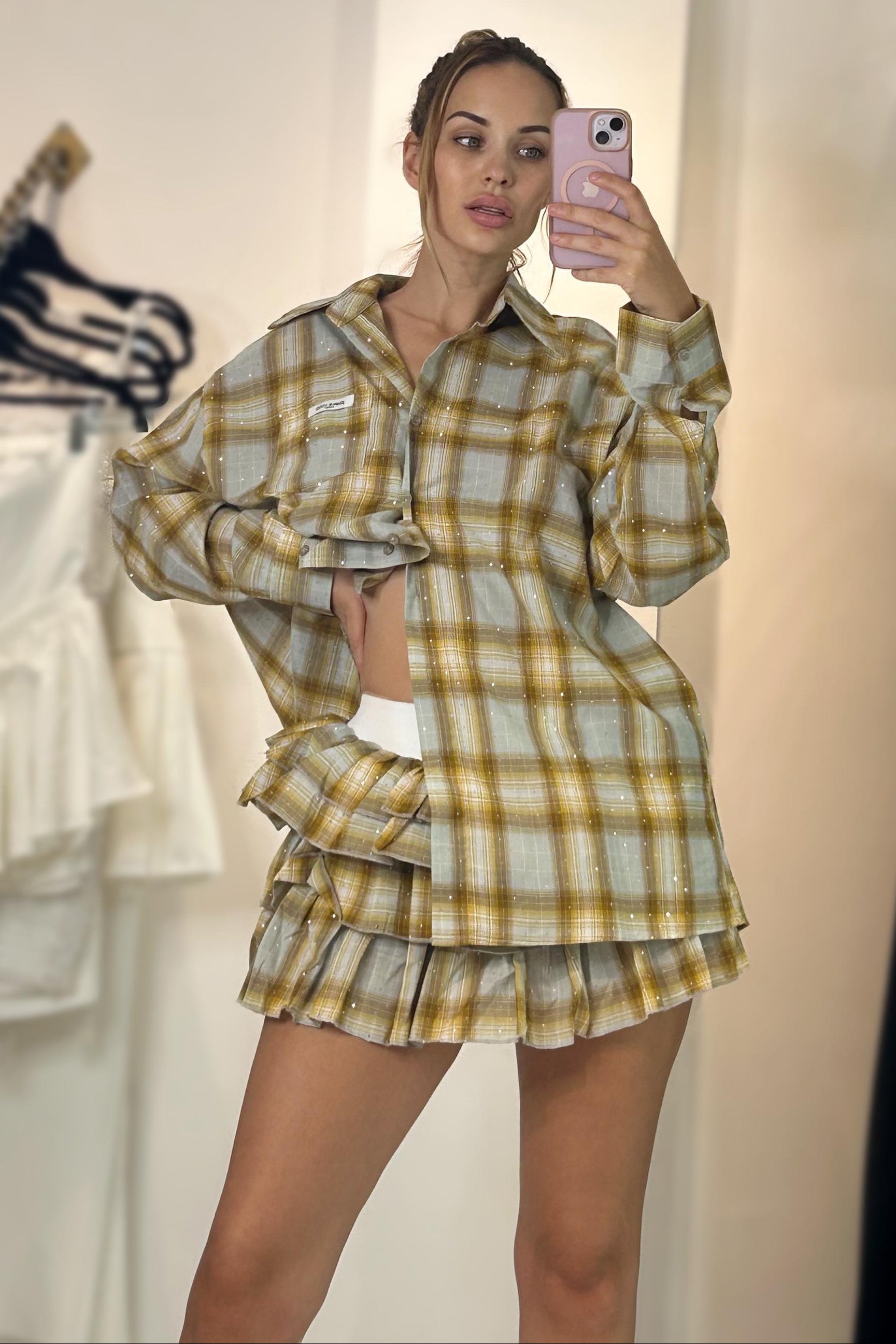 Jessica Bara Sokka Long Sleeve Plaid Top and Skirt Two Piece Set