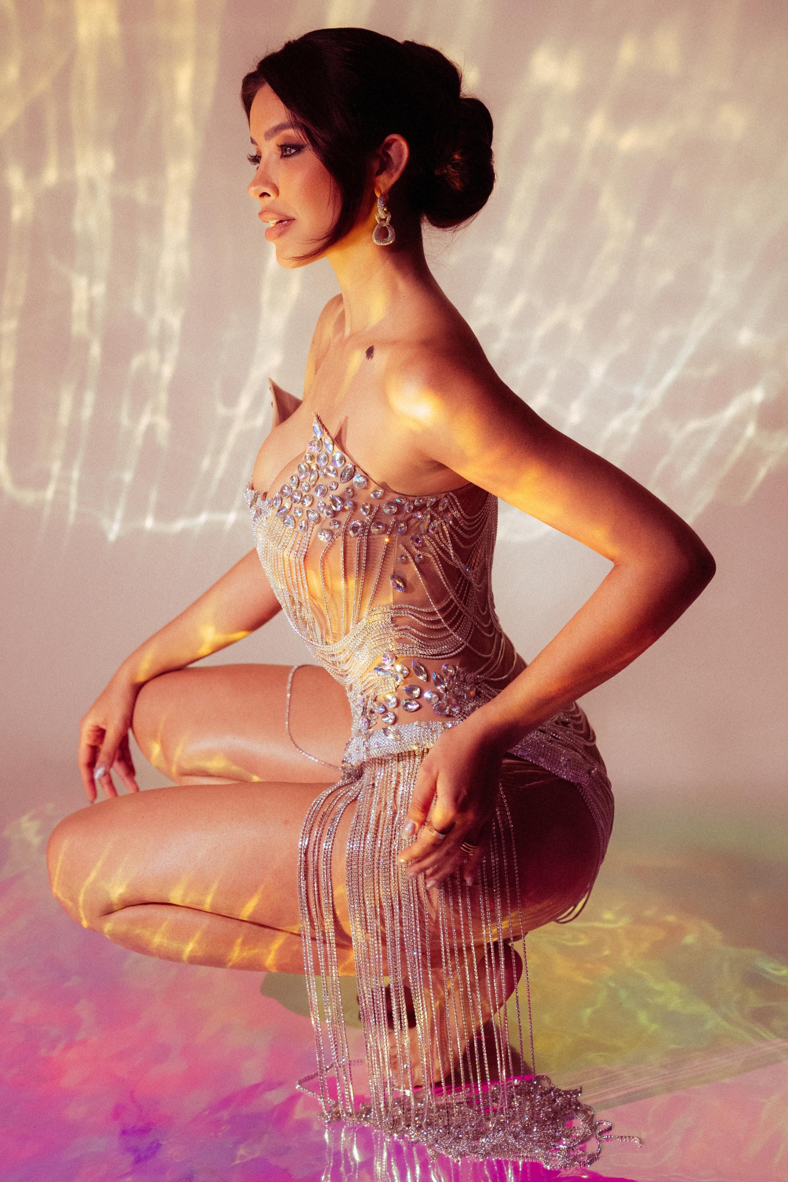 This bodycon beauty is the perfect outfit for your next occasion. Featuring a strapless, corset style mini dress with mesh fabric, thigh slit, and crystal fringe embellishments layered throughout. Simply pair with black ankle strap heels and clutch for a look that's giving the wow factor!