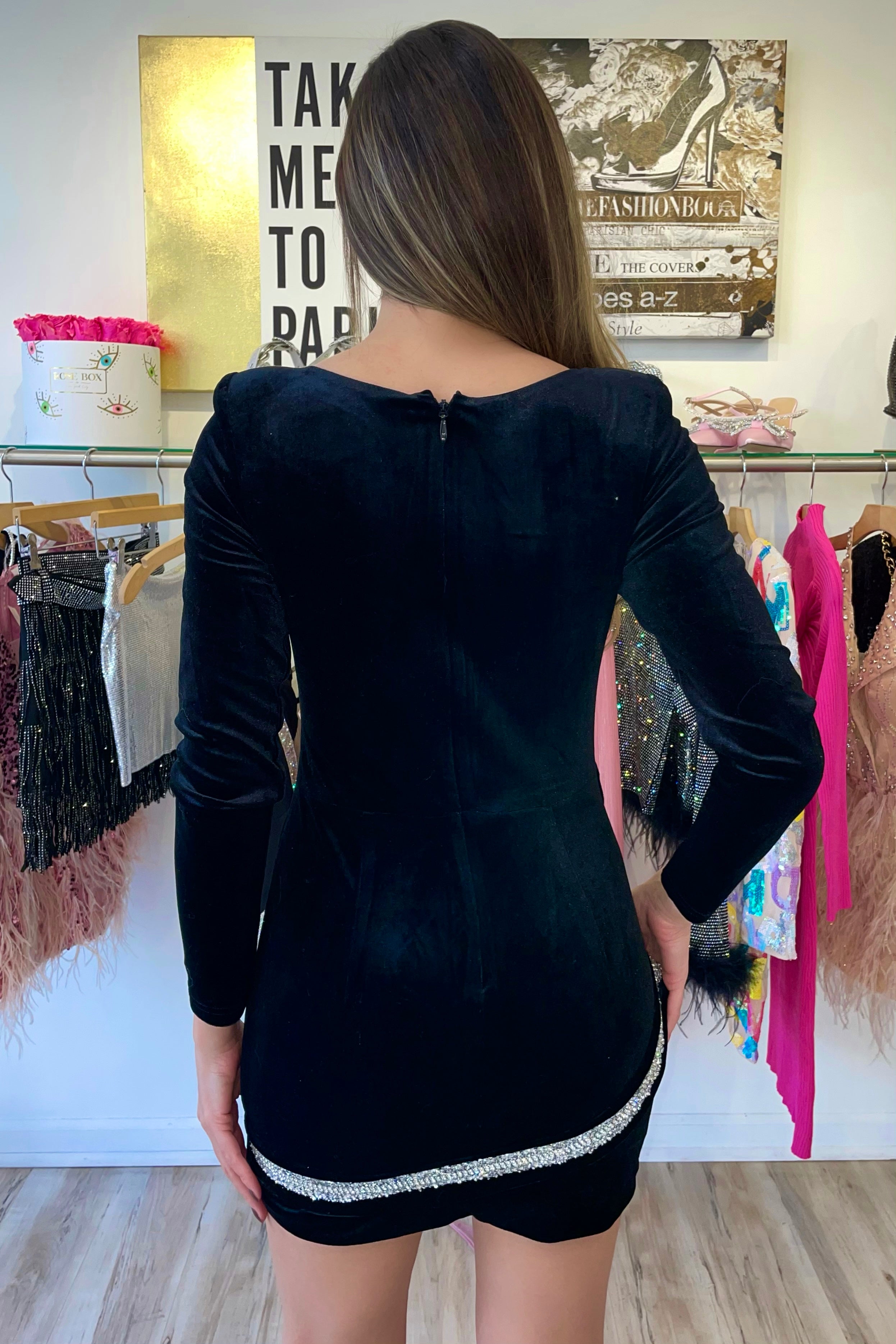 Out after dark? Then you'll love our new favorite Dress. Including a velvet material, off the shoulder style, puff sleeves, and a mini length. Pair with fun booties as seen on the model.