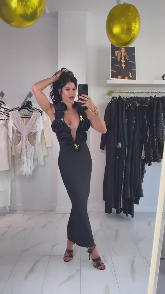Jessica Bara Polene Ruffle Deep V-Neck Maxi Dress