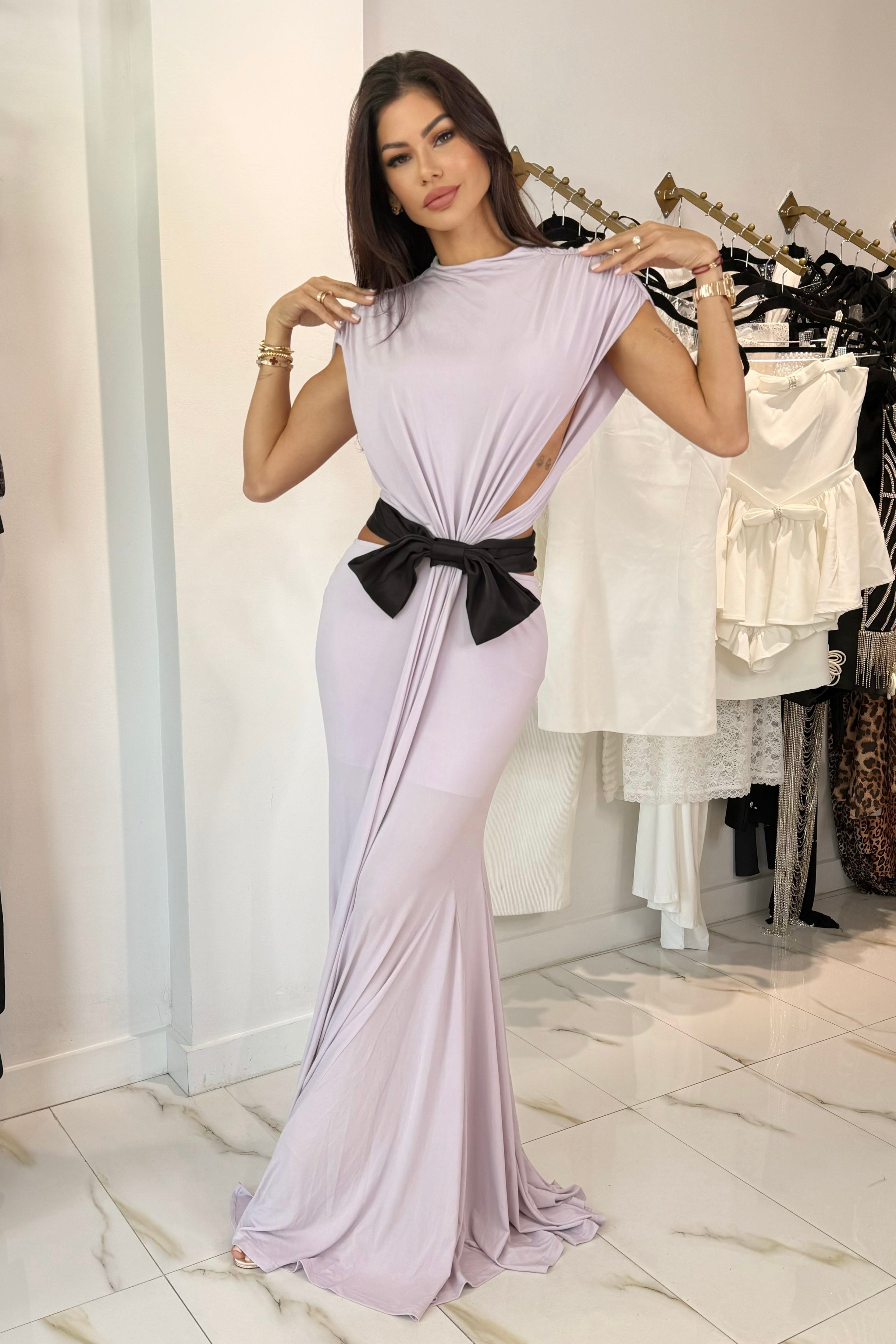 Jessica Bara Zariah High Neck Cut Out Ribbon Gown