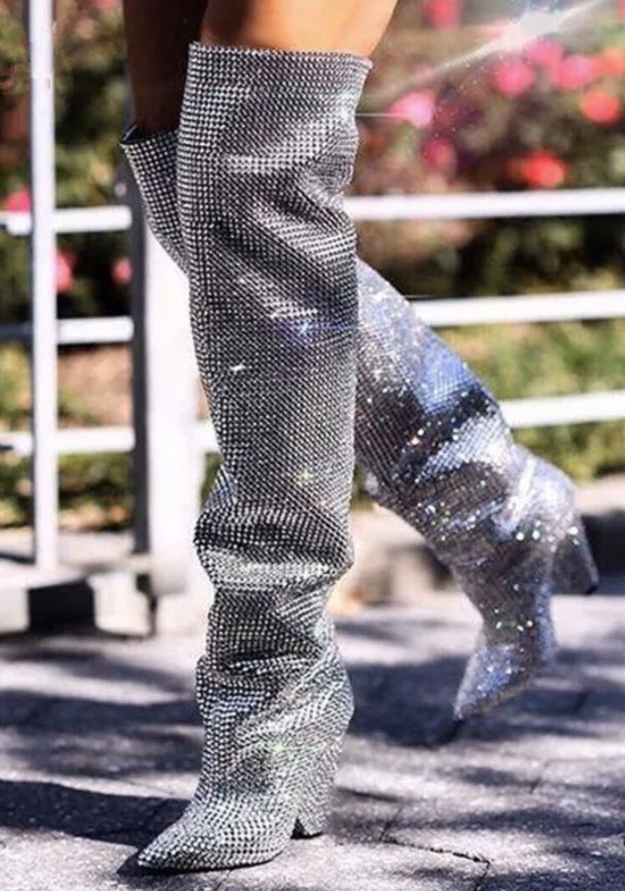 Give your going out look an edge with these chunky heeled boots. Featuring a diamante detail with an over the knee style and a slouch fit. They're a new season must-have!