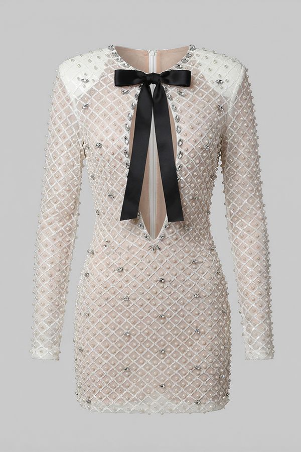 Jessica Bara Xandra Pearl Beaded Long Sleeve Cut Out Mini Dress