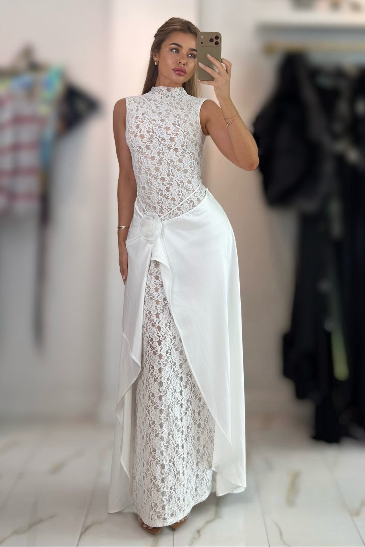Elevate your evening look with the Sheza Lace High Neck Flower Slit Maxi Dress—where elegance meets a touch of flirtation. This stunning piece features delicate lace detailing and a charming high neckline that exudes sophistication, while the strategic slit adds just the right amount of sass. The intricate flower patterns bring romance and dimension to every step, making it perfect for special occasions, date nights, or whenever you want to feel absolutely fabulous. Slip into confidence and turn heads in this show-stopping maxi.