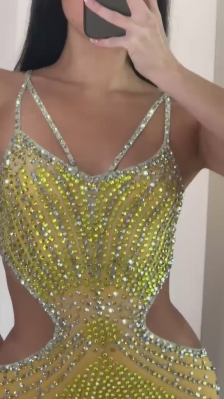 Look absolutely stunning in the Jessica Bara Crystal Cut Out Gown! With a waist cut out to show off your curves and double straps for extra security, you'll be the life of the party. So go ahead, take the room by storm and sparkle like the star you are!