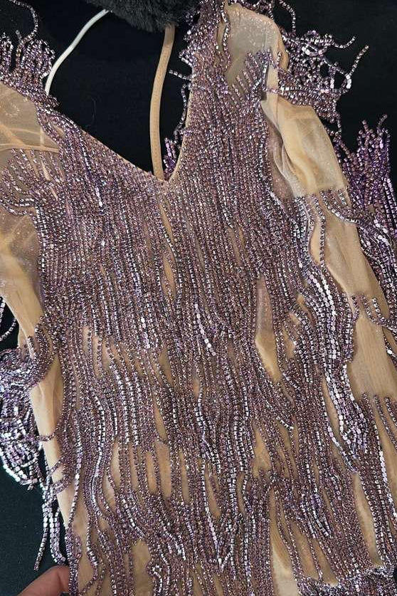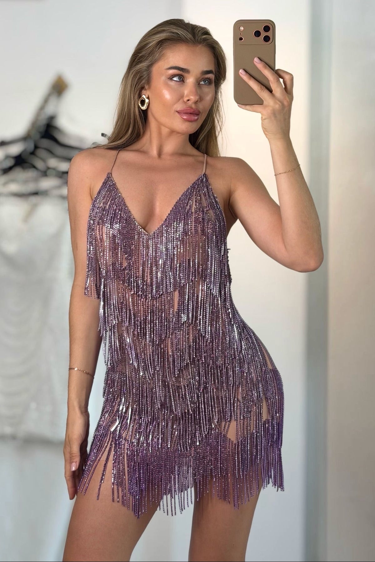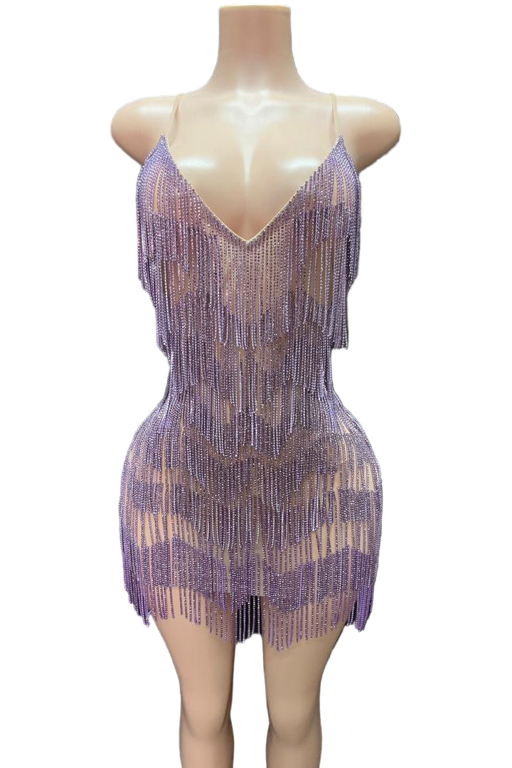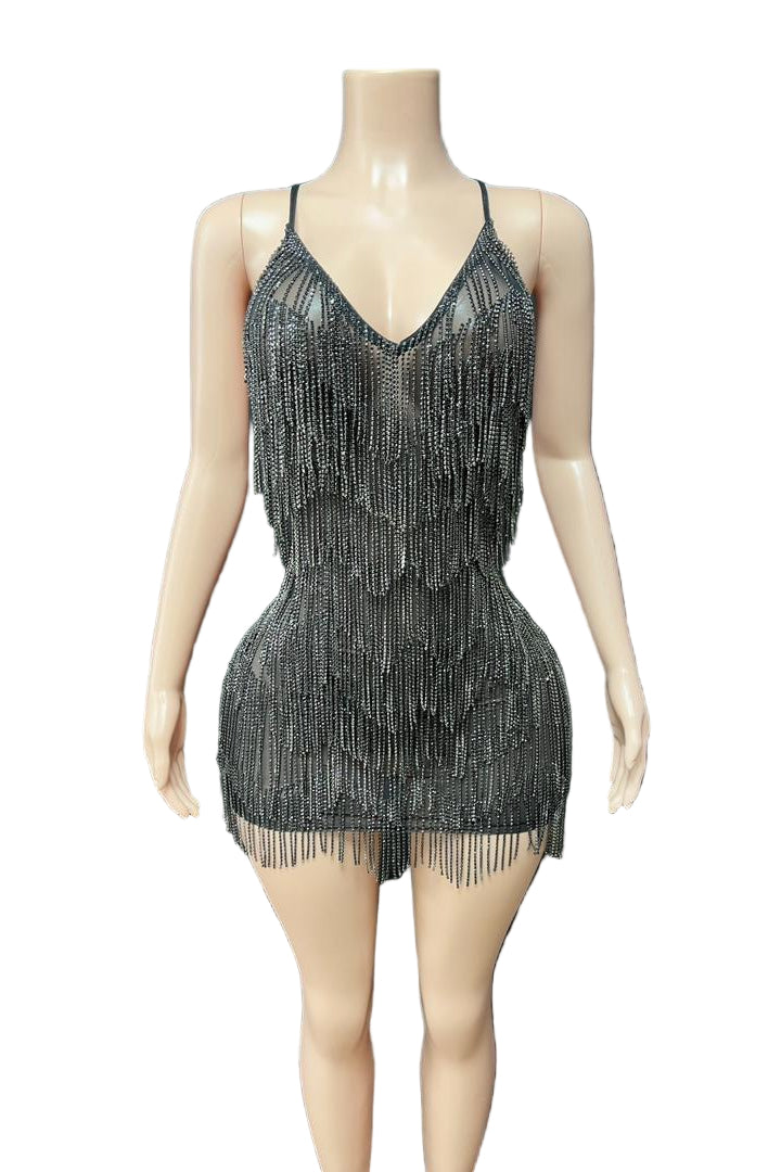 Dazzle the night away! Perfect for birthdays, red carpets, or just standing out in a crowd, this mini dress features a crystal fringe design, a criss-cross backless strap, and a v neck for a look that's sure to shine.