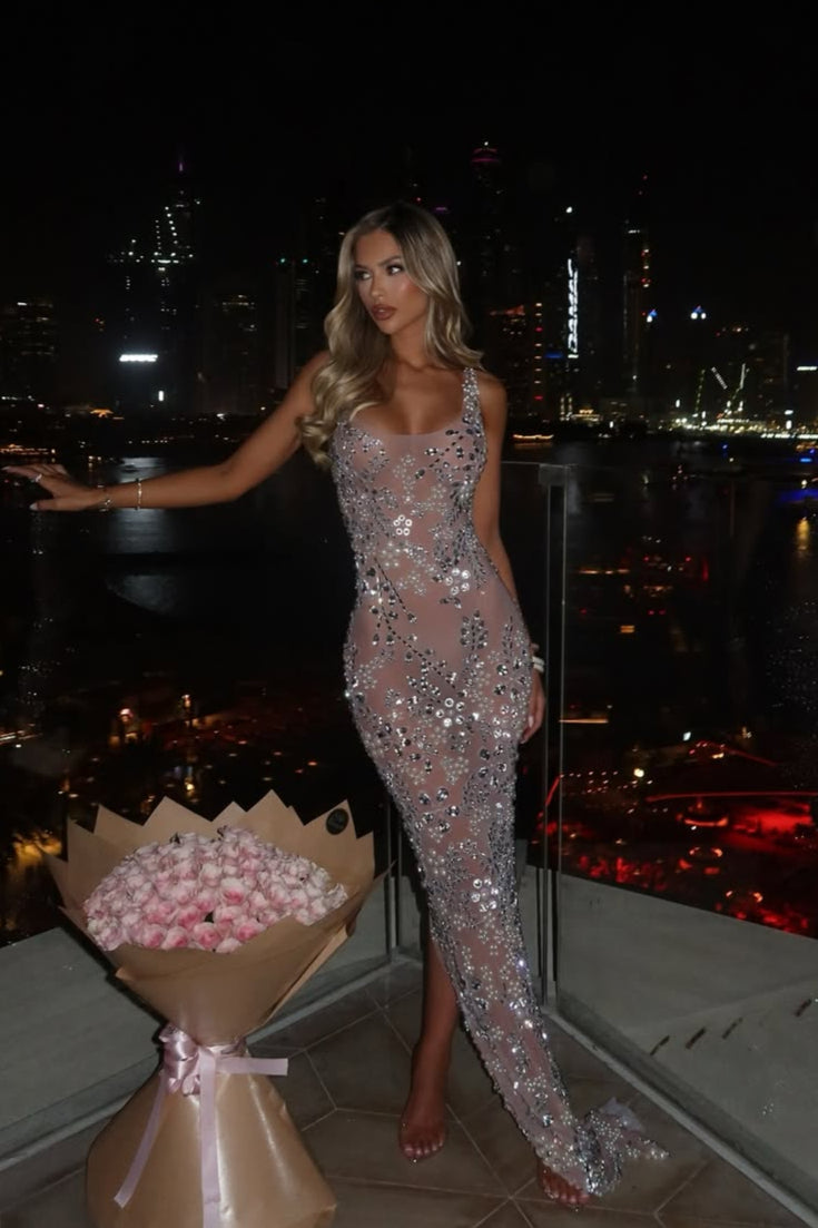 Step into a dream with the Jessica Bara Gardenia Crystal Flower Maxi Dress. Flowing gracefully and adorned with sparkling crystal flower details, this maxi dress brings a touch of whimsy to any occasion. Perfect for twirling through garden parties or stealing the spotlight at special events, it’s your go-to for effortless elegance with a playful twist