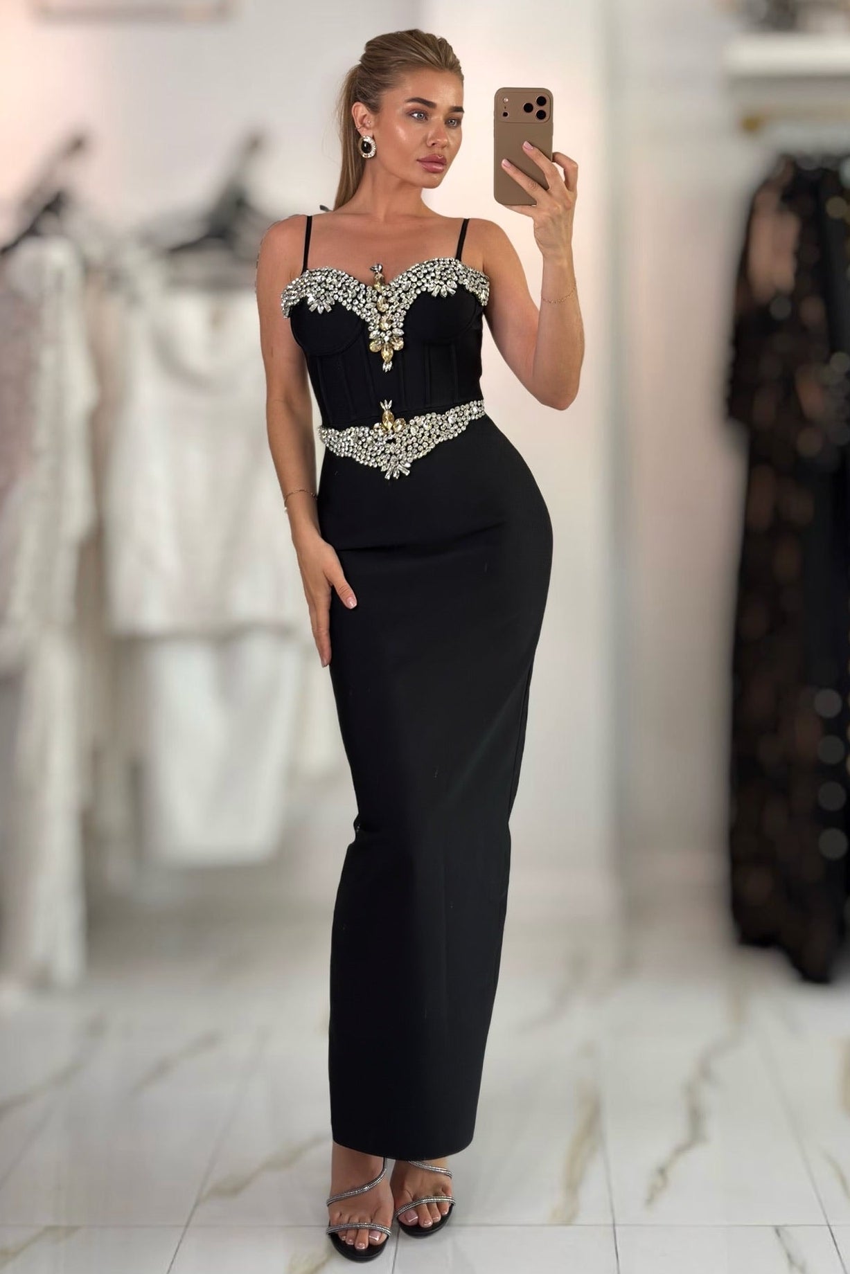 The Jessica Bara Itara Crystal Corset Maxi Dress effortlessly combines sparkle and style with its dazzling crystal-embellished corset and flowing maxi silhouette. Perfect for turning heads at any event, this dress hugs your curves while adding a touch of glam to your evening. Dance the night away feeling confident and radiant in this playful, show-stopping piece.