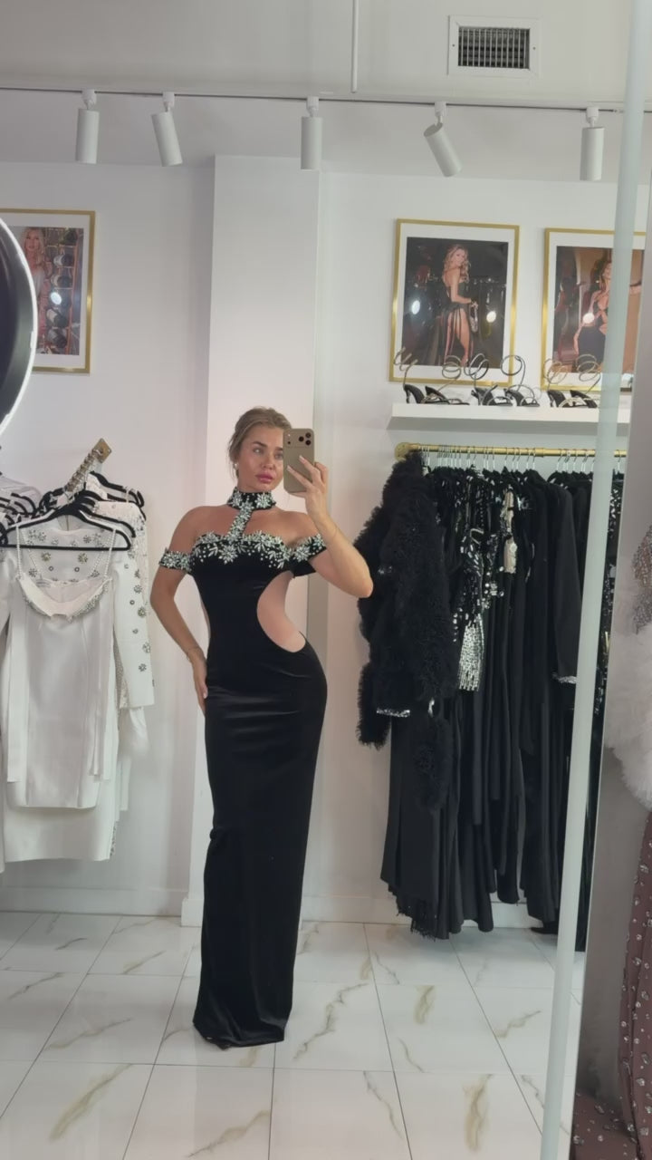 Slip into pure elegance with the Roxie Velvet Crystal Choker Cut Out Gown—where luxury meets a little bit of sass. This stunning piece features sumptuous velvet fabric that feels as divine as it looks, paired with a show-stopping choker neckline and strategic cut-outs that add just the right amount of allure. Adorned with sparkling crystals that catch the light beautifully, this gown transforms you into the main character at any event. Perfect for those moments when you want to turn heads and feel absolutely fabulous.