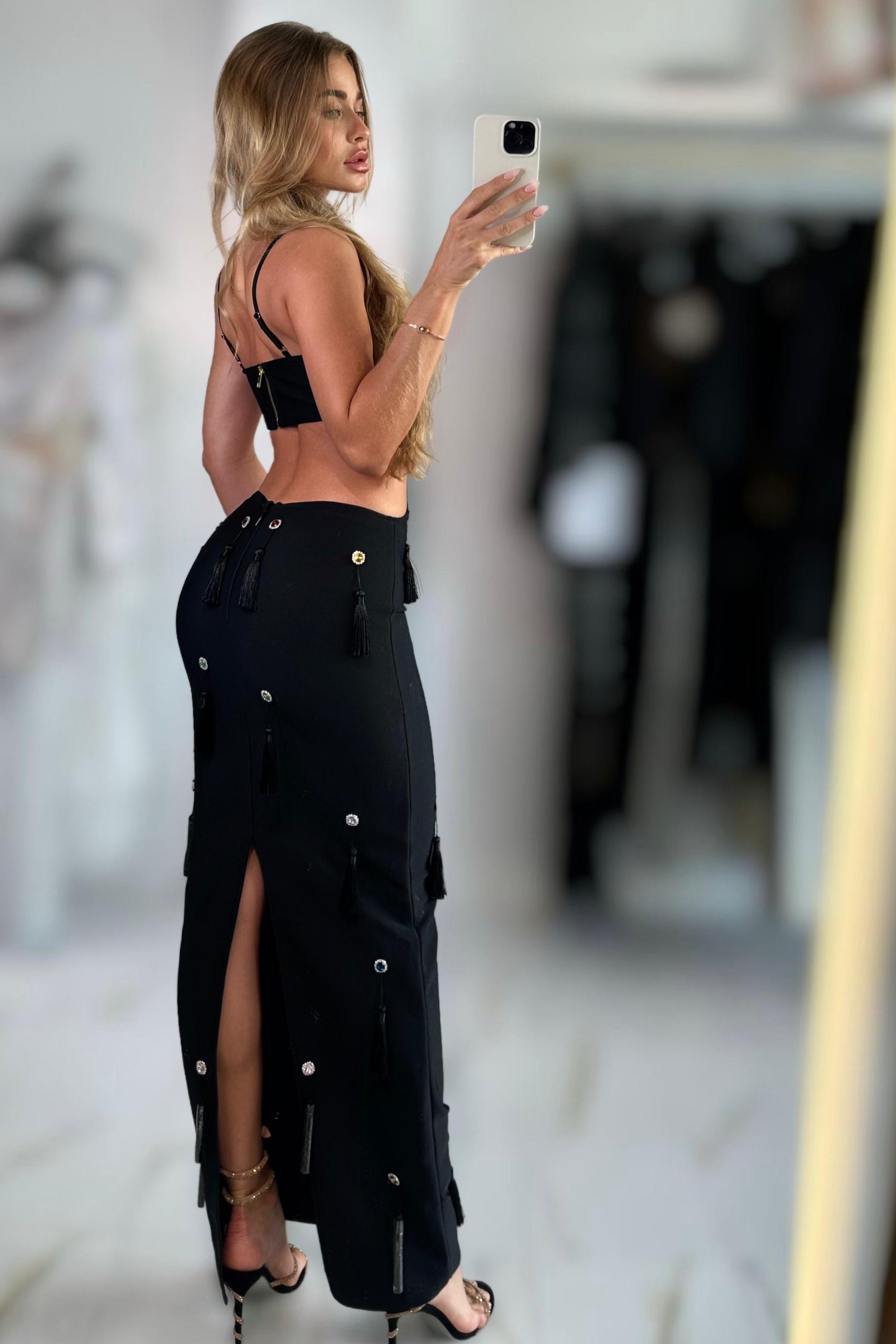 Make a statement in the Aldria Fringe Cut Out Maxi Dress—where bold cutouts meet flirty fringe for a look that's equal parts daring and fun. This floor-length stunner features strategic cutouts that add an edgy vibe while the playful fringe detailing brings movement and personality to every step. Perfect for nights when you want to turn heads and feel absolutely fabulous. Slip into confidence and let your style do the talking.