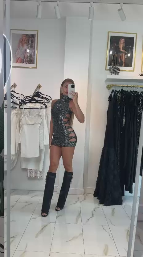 Jessica Bara Georgian Sequin High Neck Halter Cut Out Mini Dress