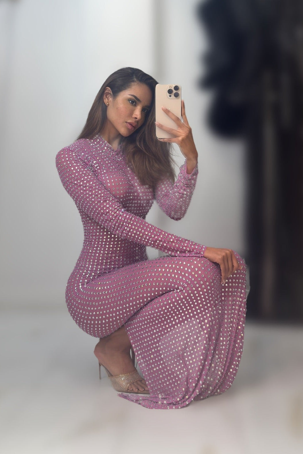 We're going crazy for this all crystal look dolls. Featuring a long sleeve style with a turtleneck, crystal covered material, and a split hem in the back. Style with simple heels and big curly hair for an eye-catching look at your next red carpet event.