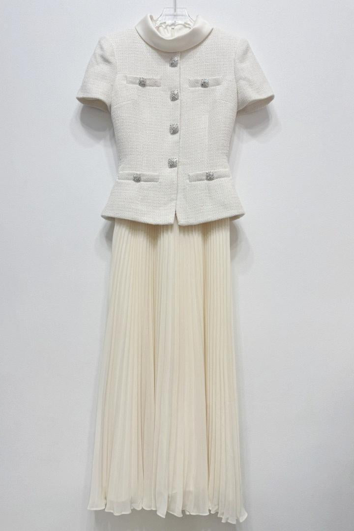 Jessica Bara Dairie Tweed Pleated Maxi Dress