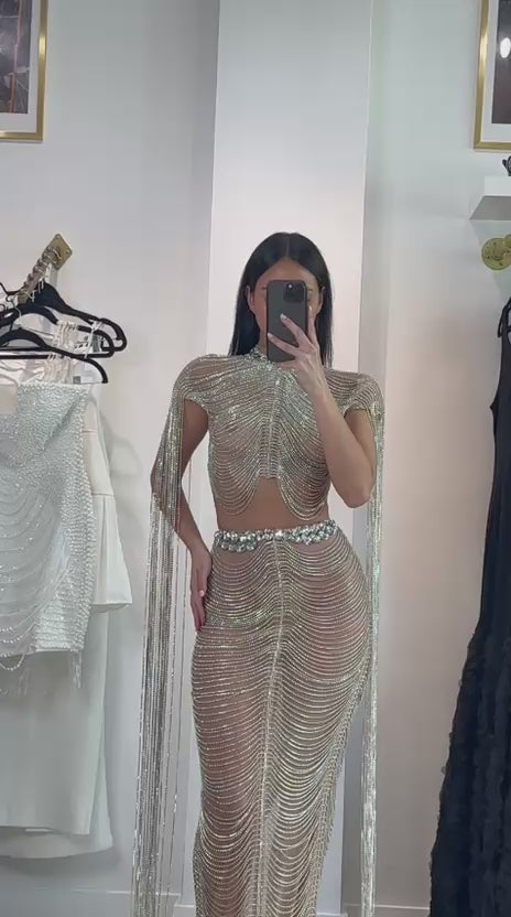 Jessica Bara Alaret Crystal Fringe Top and Maxi Skirt Two Piece Set
