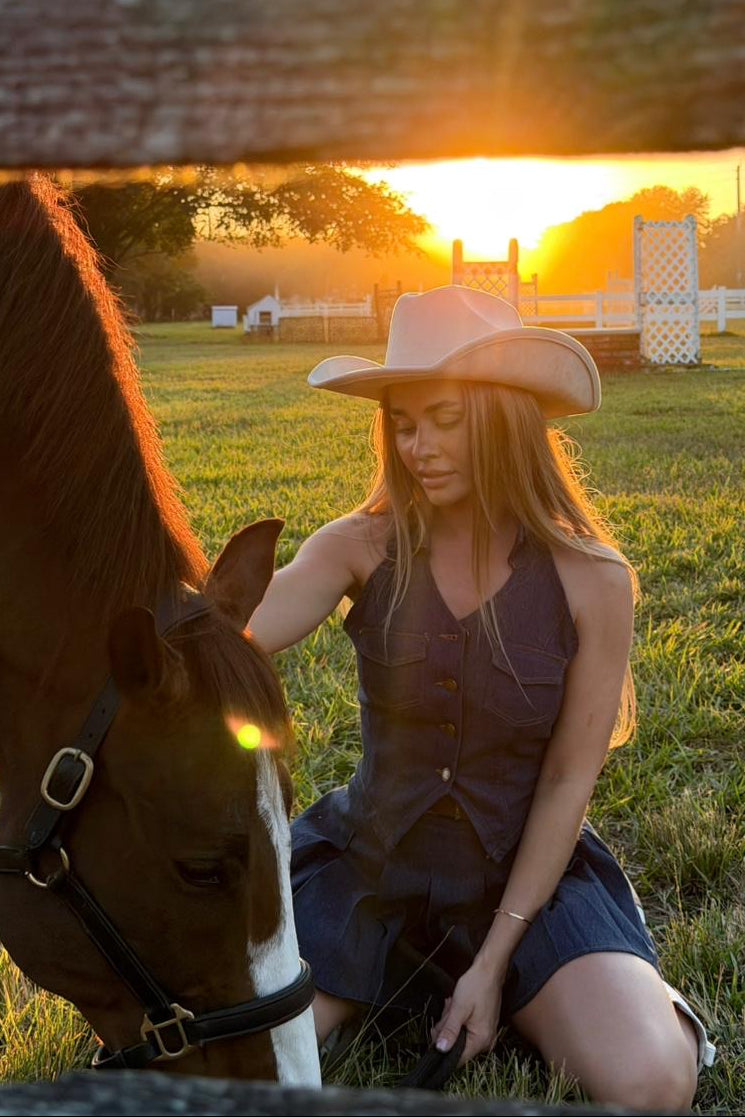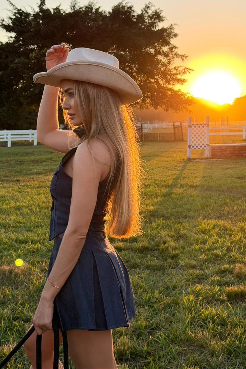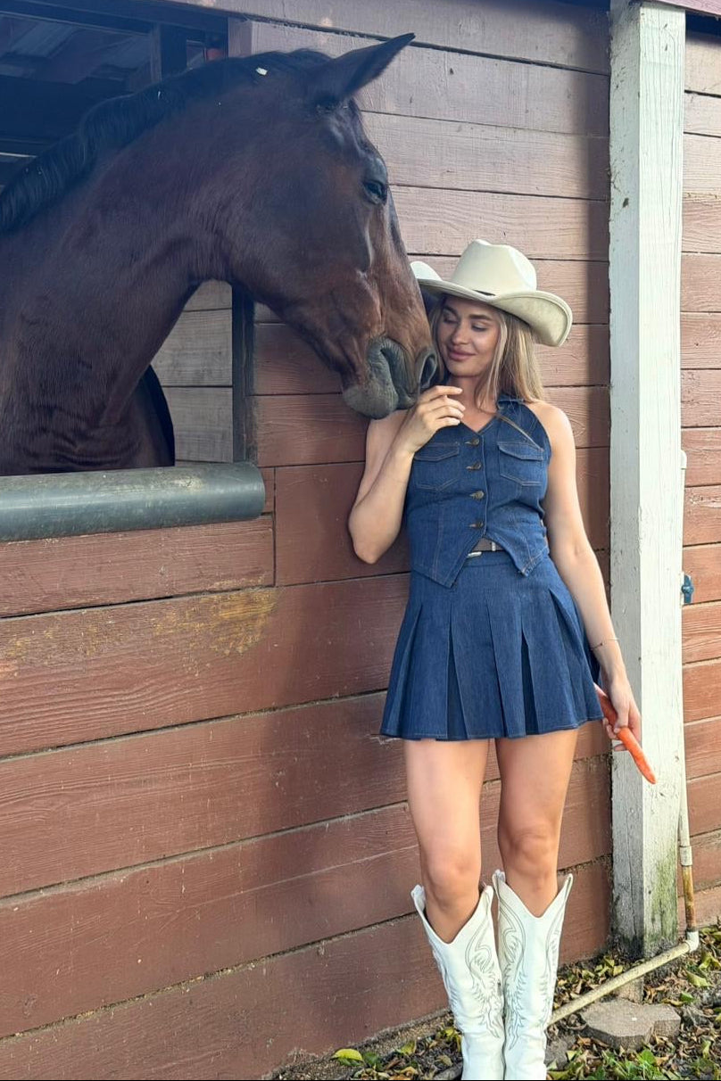 Jessica Bara Dreane Denim Halter Neck Top And Pleated Mini Skirt Two Piece Set