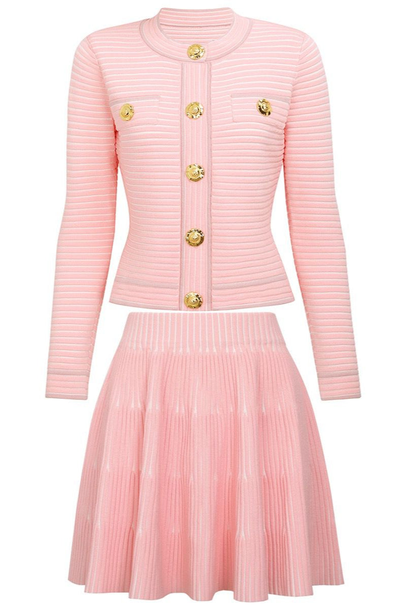 Jessica Bara Liza Gold Button Long Sleeve Top and Mini Skirt Two Piece Set
