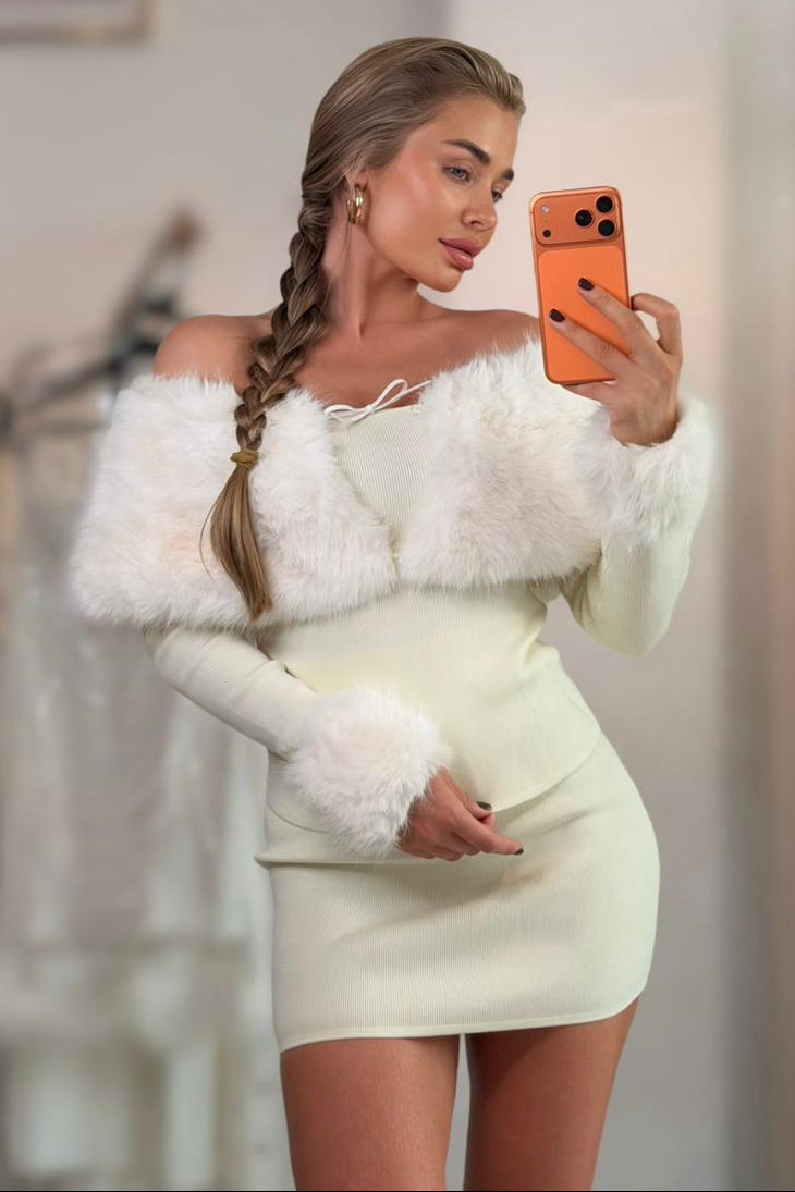 Jessica Bara Resiena Off The Shoulder Faux Fur Top and Mini Skirt Two Piece Set