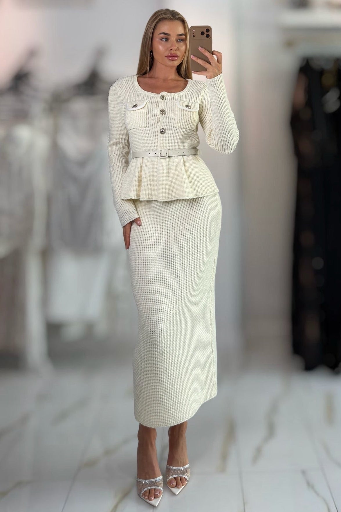 Jessica Bara Shavida Gold Button Long Sleeve Belted Top and Maxi Skirt Two Piece Set