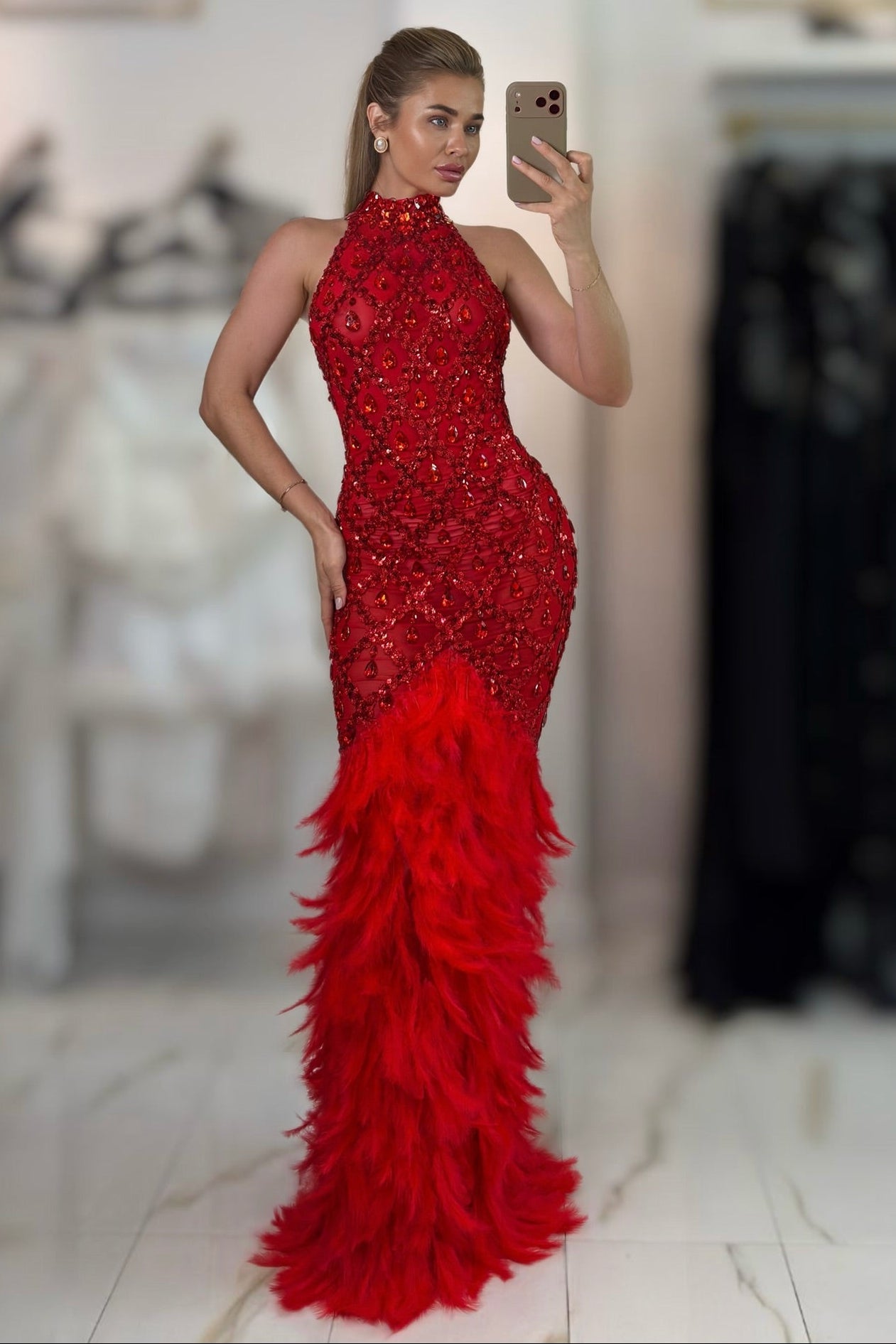 Jessica Bara Fasela Crystal High Neck Feather Gown