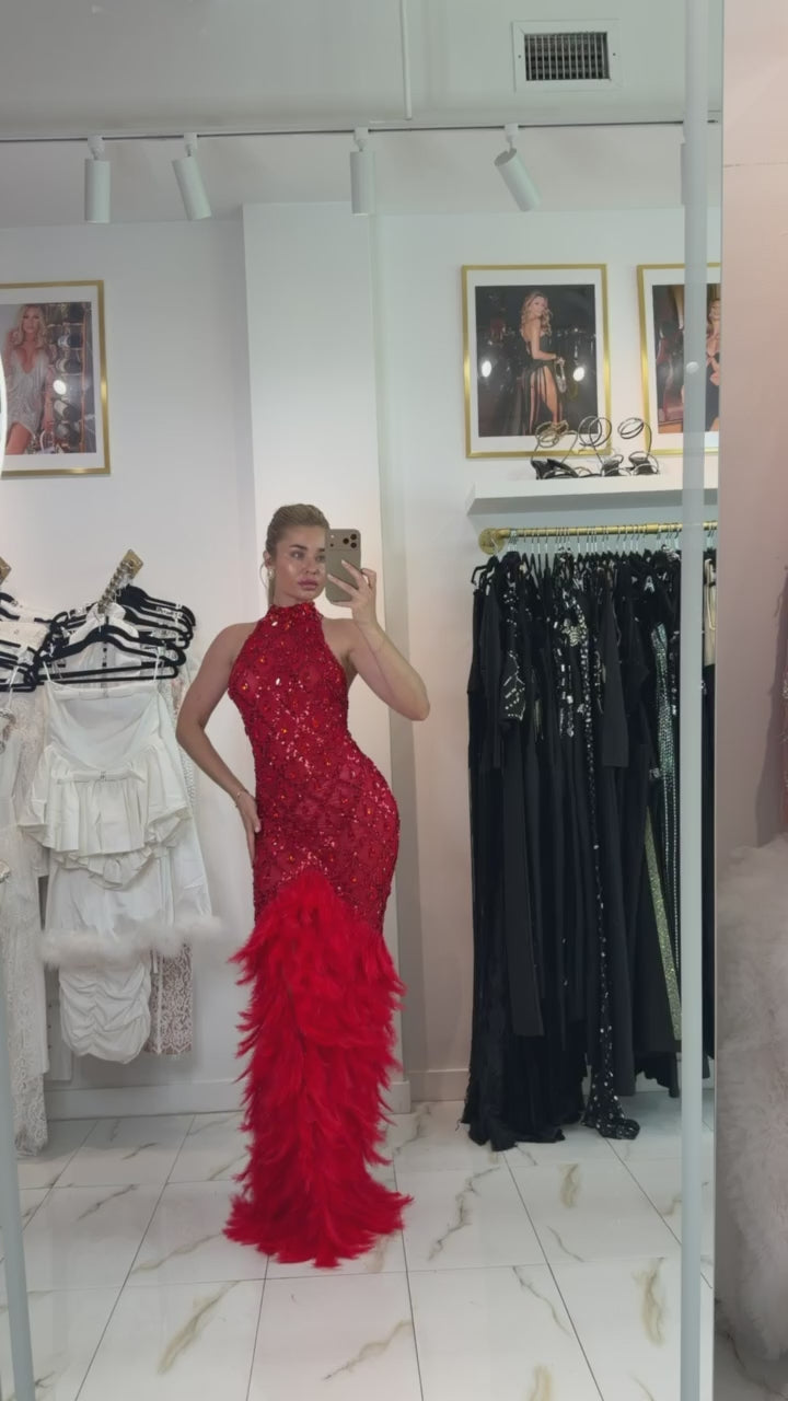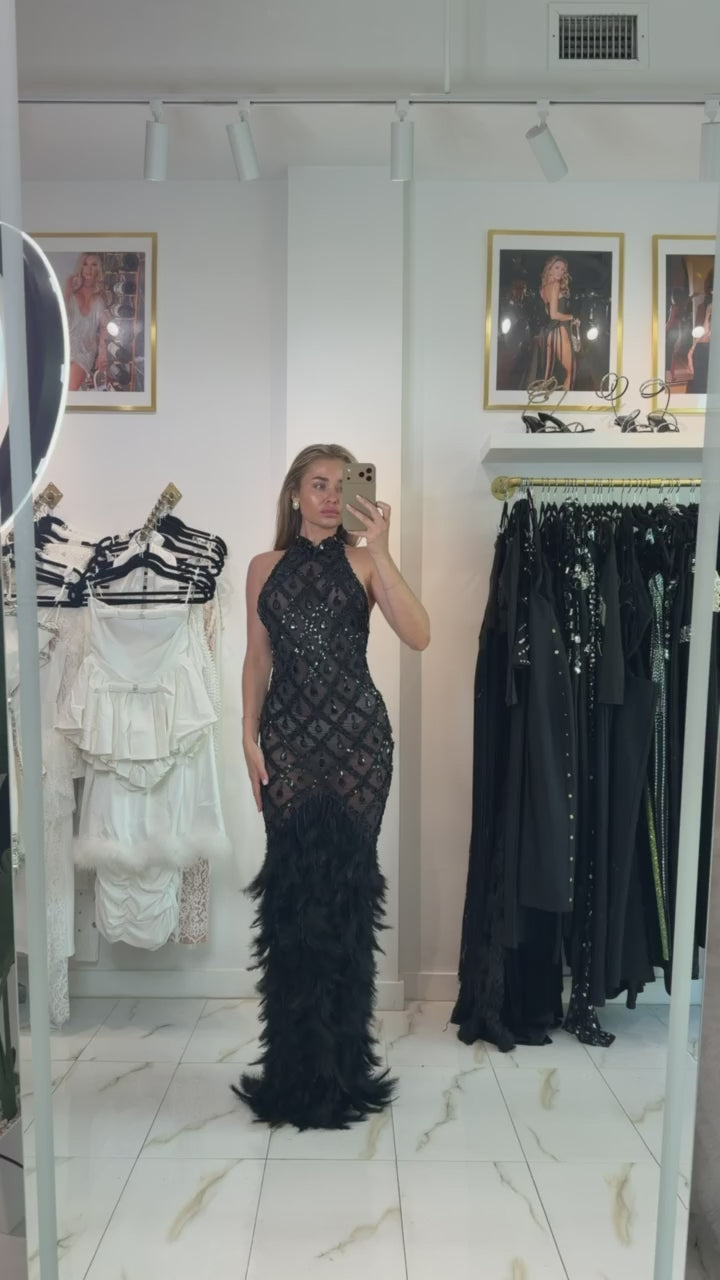 Elevate your evening with the Fasela Crystal High Neck Feather Gown—where glamour meets whimsy. This stunning piece features an elegant high neckline adorned with sparkling crystals that catch the light with every move, while luxurious feathers add a playful, show-stopping dimension. Perfect for those who dare to make a statement, this gown transforms any special occasion into an unforgettable moment. Slip into sophistication and let your inner diva shine.