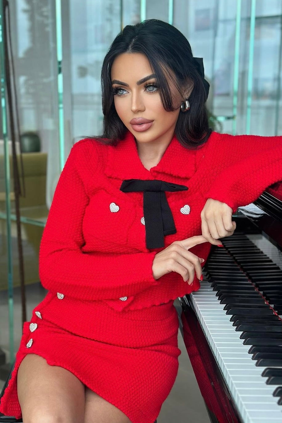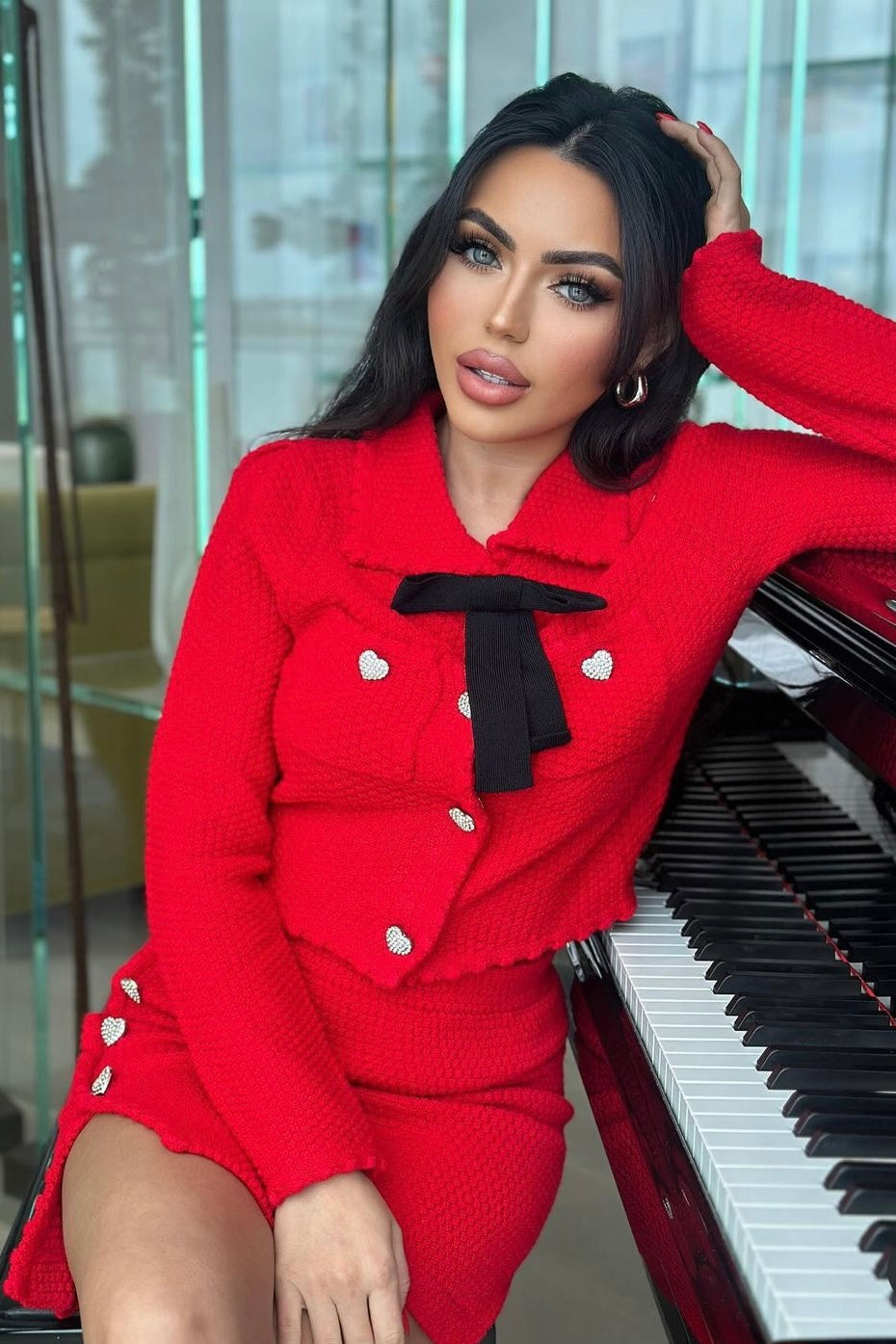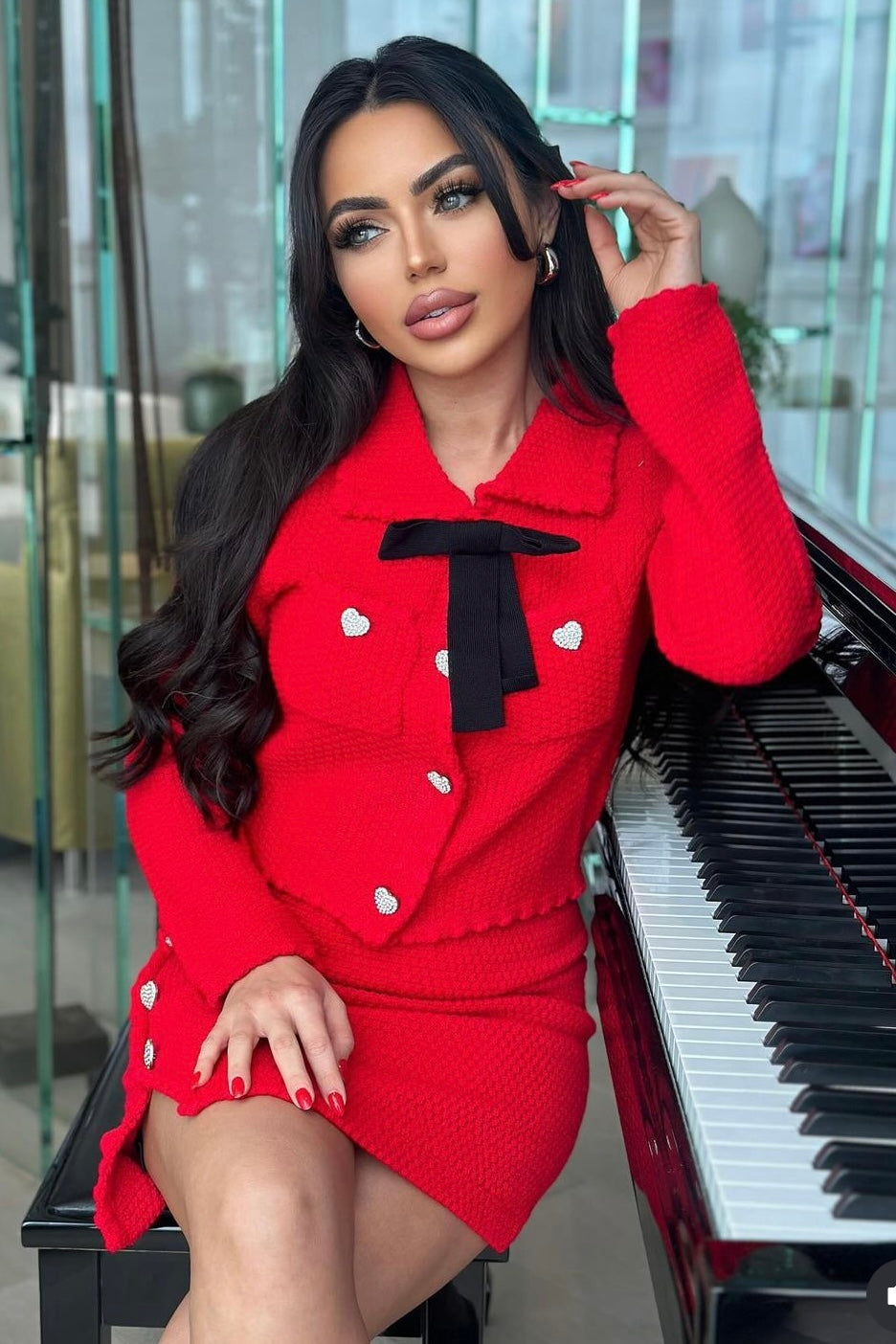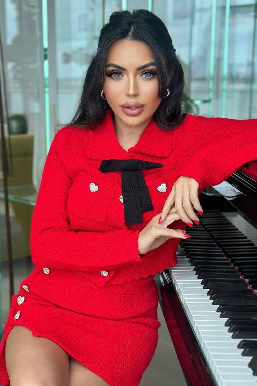 Stay warm and stylish in this Jessica Bara two-piece set! This tweed cardigan and mini skirt duo is perfect for any occasion, featuring heart buttons and a detachable bow for added flair. You'll stand out in the crowd with the classic red color and look great too!