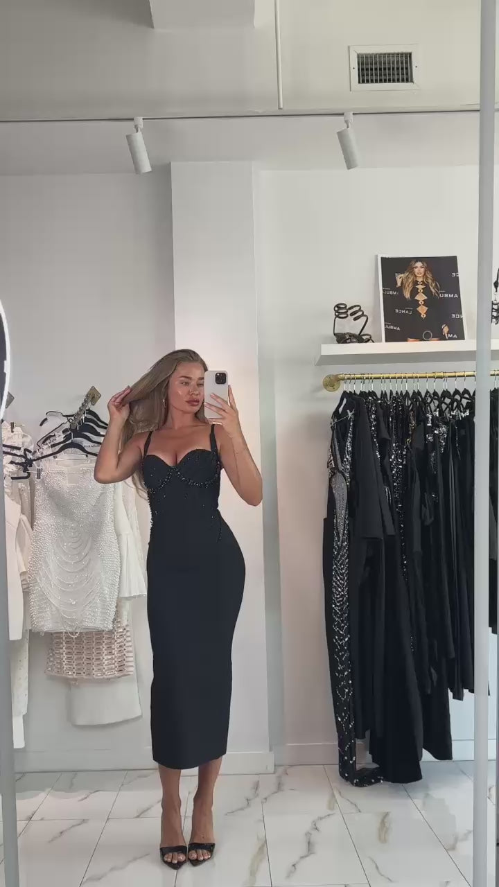 Turn heads effortlessly in the Jessica Bara Razel Crystal Bodycon Maxi Dress. This sleek, figure-hugging silhouette sparkles with crystal accents, adding just the right amount of glam to your look. Perfect for nights when you want to shine bright and feel fabulous, this dress combines elegance with a playful edge. Slip into it and let your confidence do the talking!