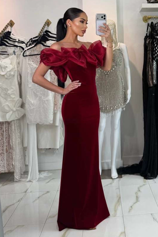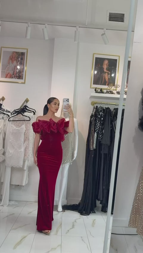 Dress to impress in the Jessica Bara Zayera Ruffle Velvet Off The Shoulder Gown! This stunning gown features a playful ruffle design and soft velvet fabric, perfect for any special occasion. Show off your unique style with this one-of-a-kind piece.