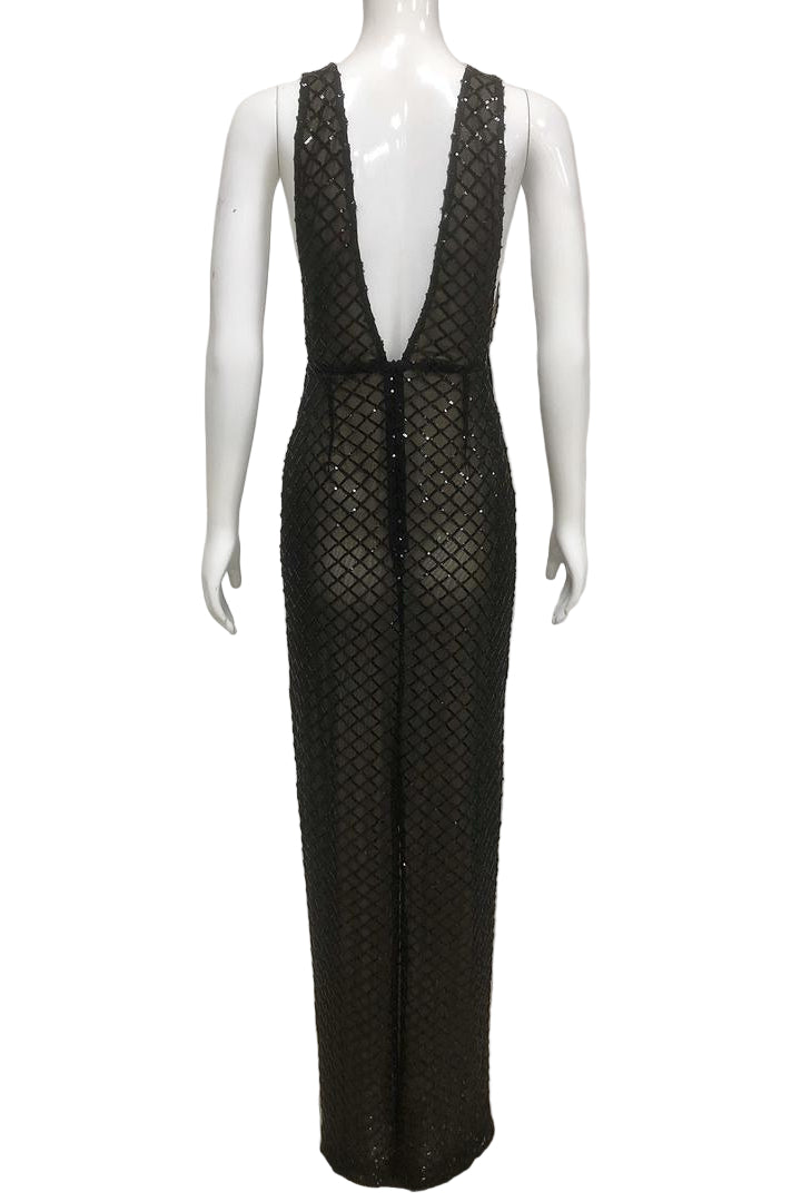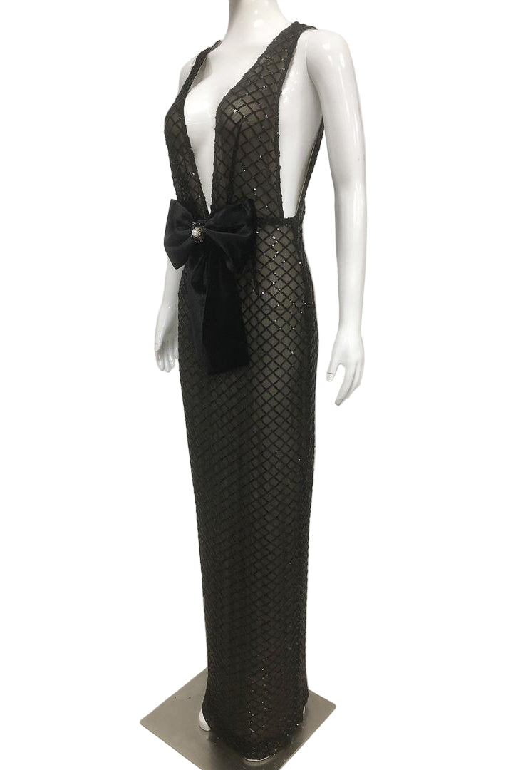 Jessica Bara Avinel Deep V-Neck Mesh Ribbon Maxi Dress