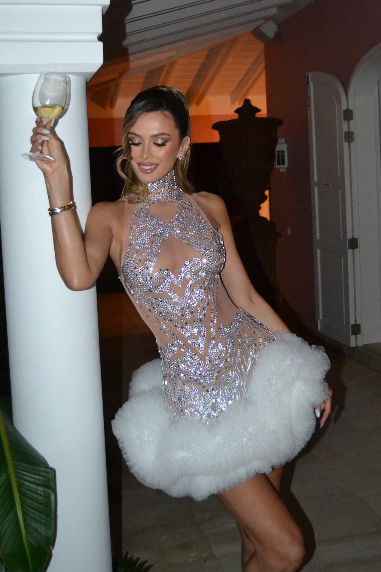 Slip into pure glamour with the Hazira Crystal Halter Ruffle Mini Dress—where sparkle meets sass. This show-stopping piece features a flattering halter neckline and playful ruffle detailing that catches every light and every eye. The shimmering crystal embellishments add just the right amount of dazzle for nights when you want to shine brighter than the stars. Perfect for parties, celebrations, or whenever you're ready to turn heads and own the room.