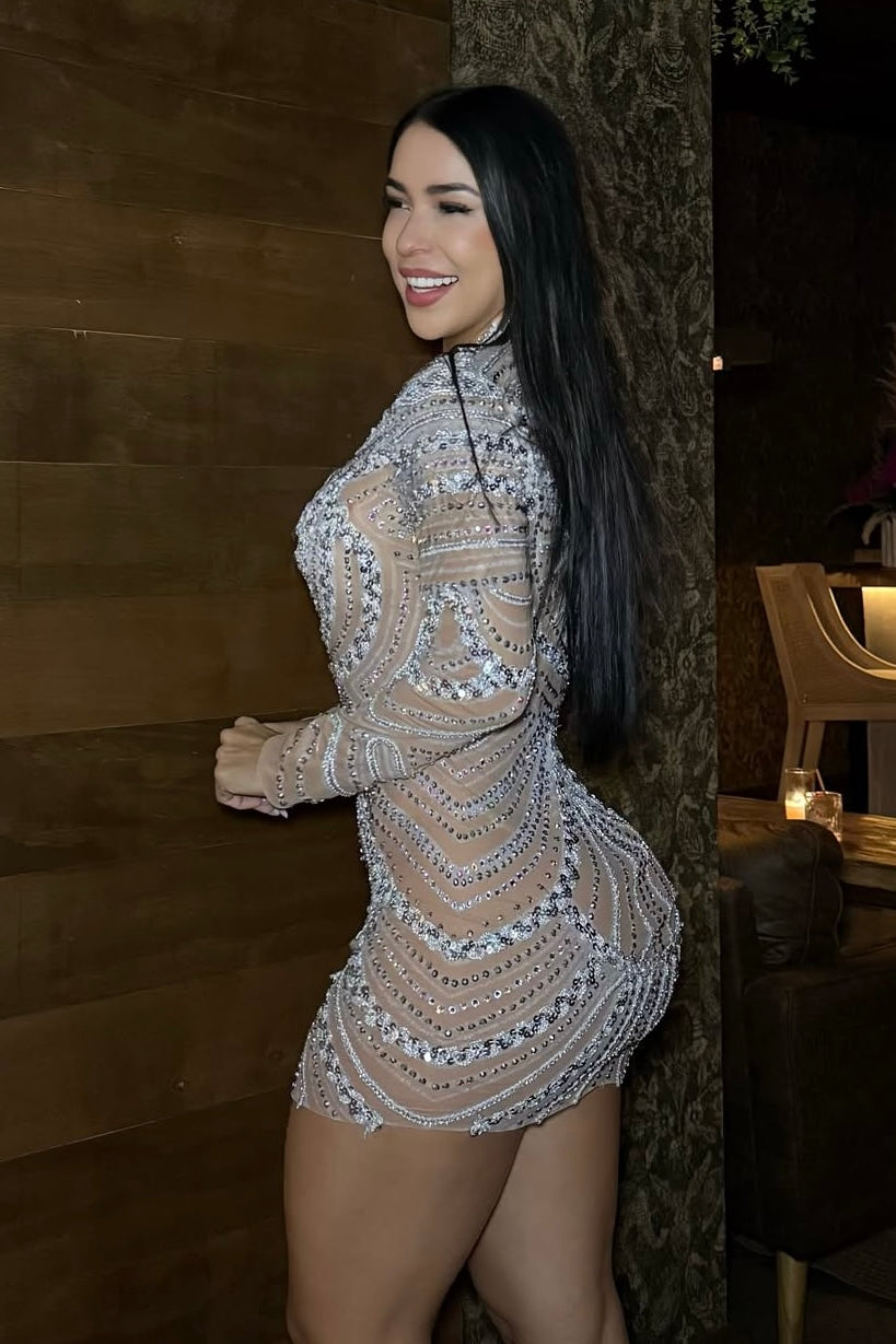 Jessica Bara Arabella Crystal Mesh Long Sleeve Mini Dress with Stockings