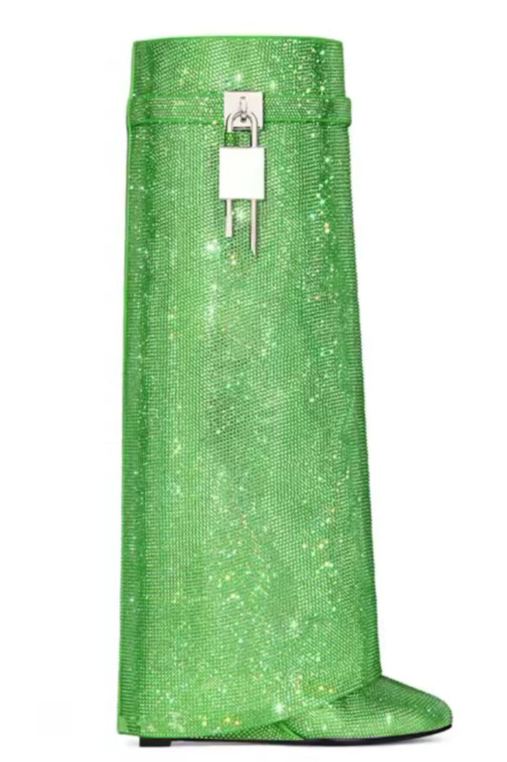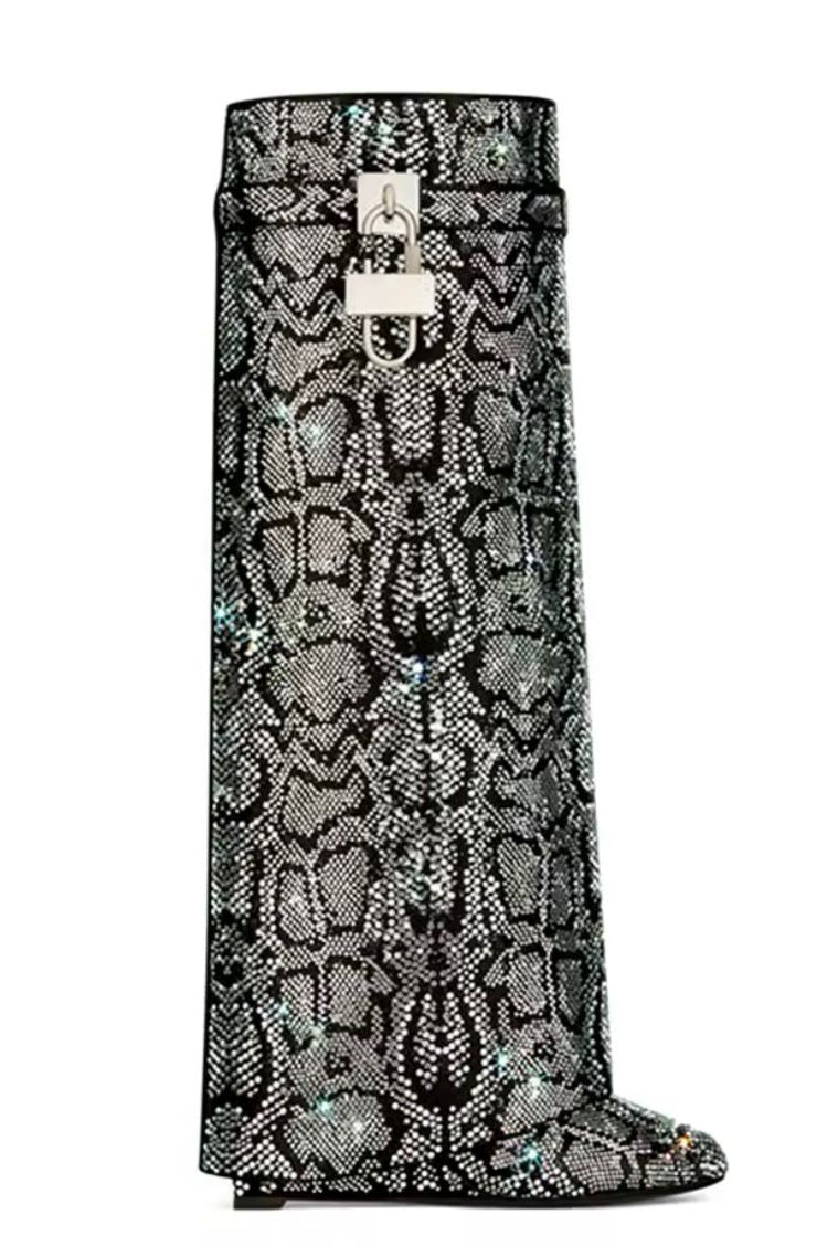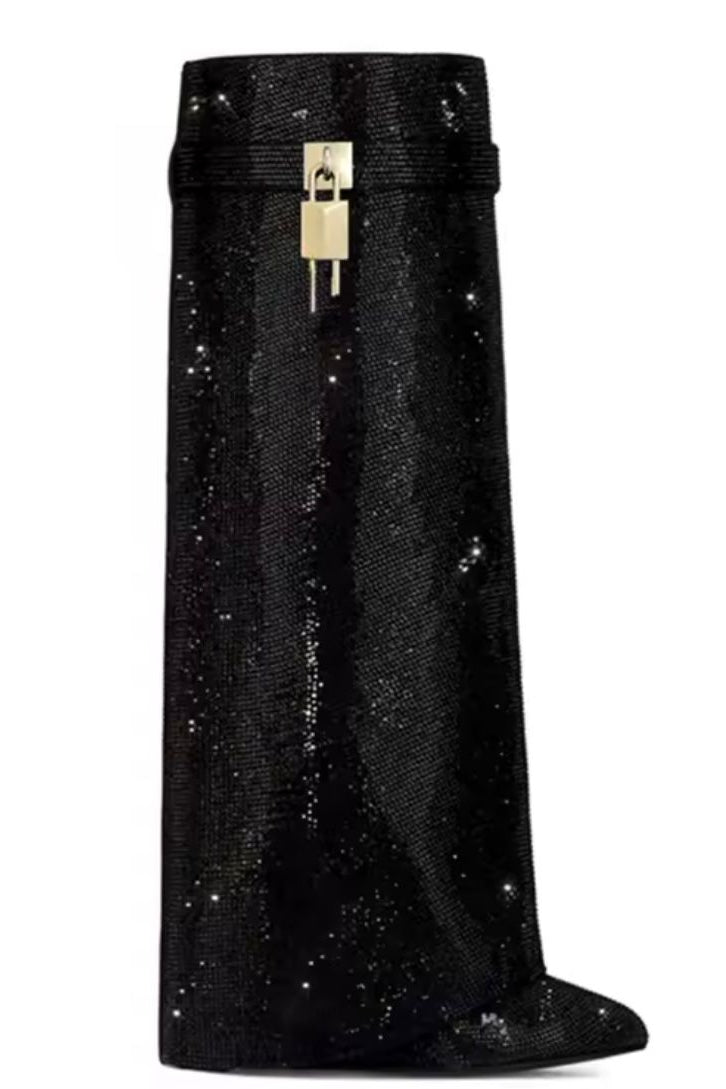 Step out in style with Jessica Bara's glitzy Ciara Knee High Boots. These boots are not just for fashion, but also feature a comfortable cuffed design. Perfect for making a statement and staying cozy all day long. Available in multiple sizes and colors. (Trust us, they're worth it!)