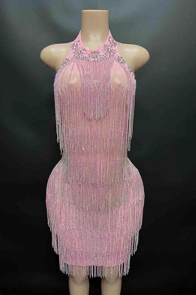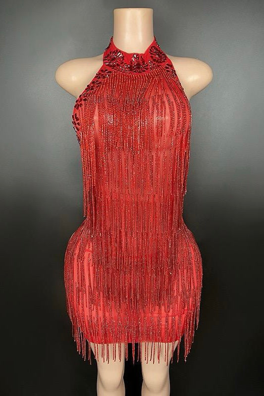 Jessica Bara Elisa High Neck Halter Crystal Fringe Mini Dress