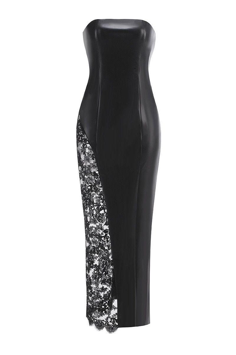 Jessica Bara Snape Strapless Tube Leather Inner Lace Slit Maxi Dress