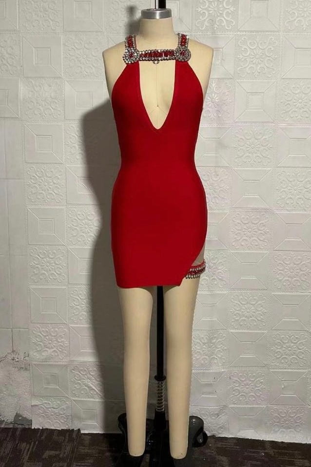 Step on the scene stylish! This mini features a bandage material, crystal straps, a sultry leg slit, and plunging neckline. Style with black pumps and a slick back pony for a jaw-dropping look.