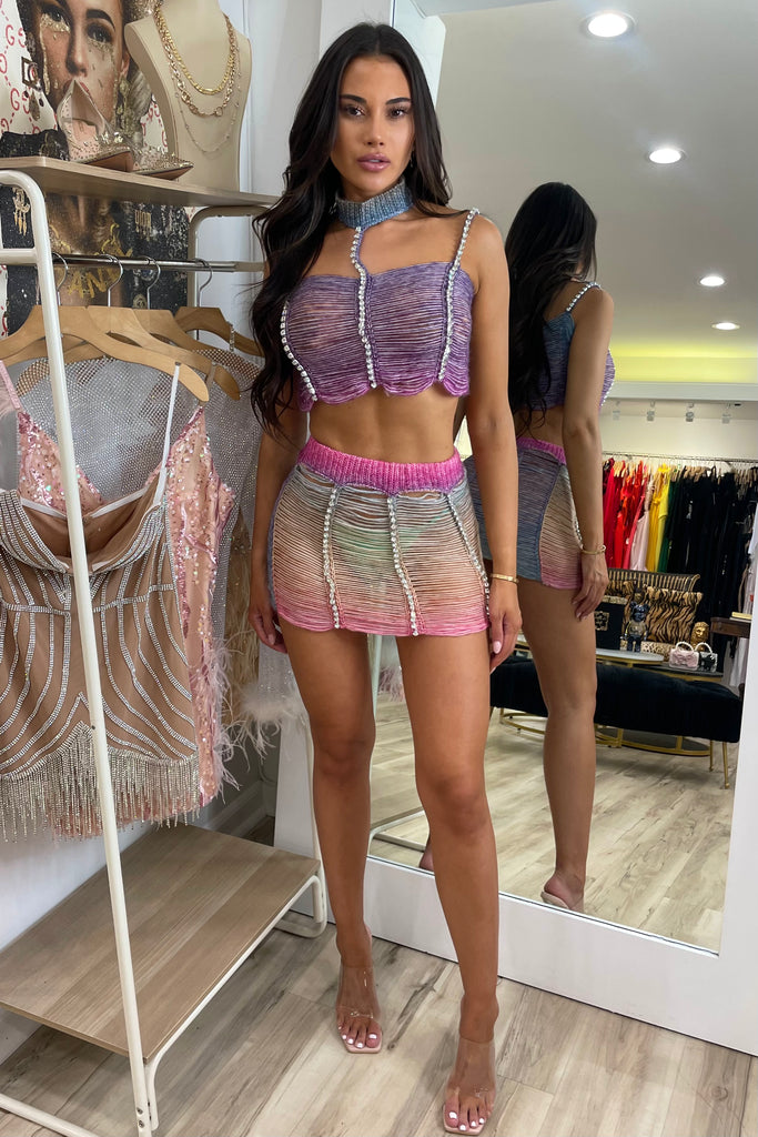 This Tahiti set is perfect for the upcoming summer season. Crafted from a lightweight colorful knit fabric, you'll stay comfortable and stylish in warmer weather. This two piece set features an embellished crystal top and mini skirt for a flirty, yet sophisticated, look.
